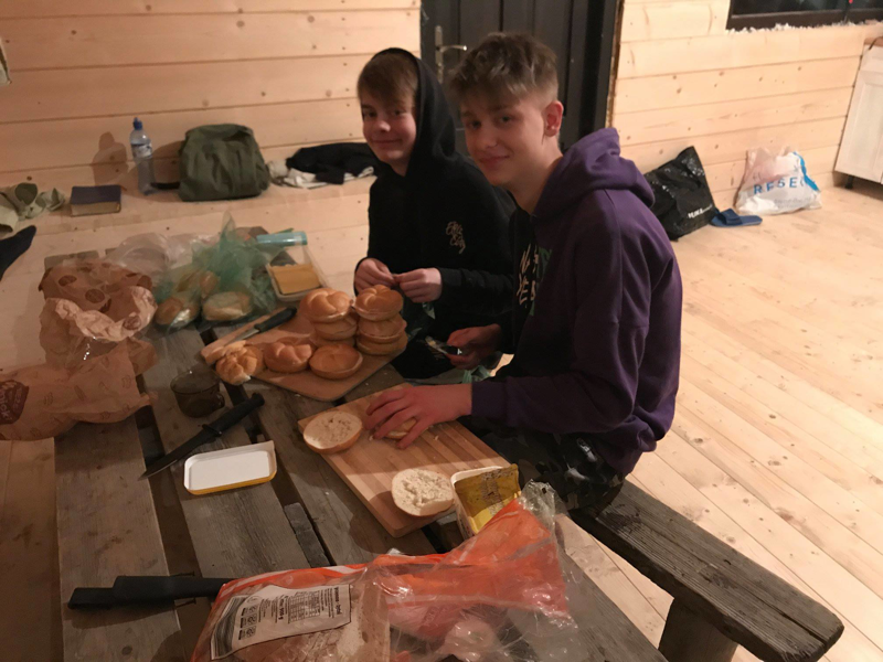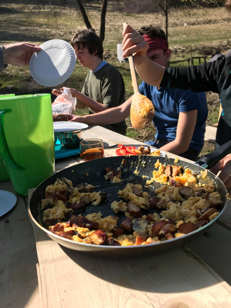 Na szczycie pochłonęliśmy resztę prowiantu, posiedzieliśmy trochę i wróciliśmy. Zaraz po wejściu do stodoły dh Kazik i dh Kamil zabrali się do przygotowywania śniadania. Była to jajecznica z resztką kiełbasek z kolacji.