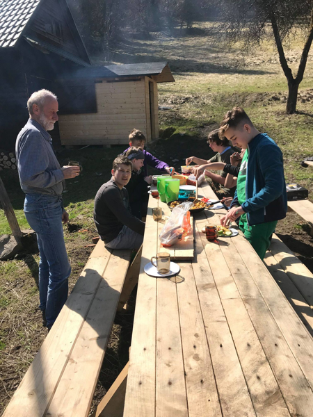 W piątek 29 marca, późnym popołudniem przybyliśmy do Raby. Od razu zabraliśmy się za rozpalanie w kominku i ogniska. Przygotowanie kolacji trochę zajęło, jednak w końcu wszyscy usiedli wokół ogniska, by zjeść pyszne kiełbaski z chlebem i serem. Po kolacji dh komendant poprowadził studium biblijne na temat przyjaźni.